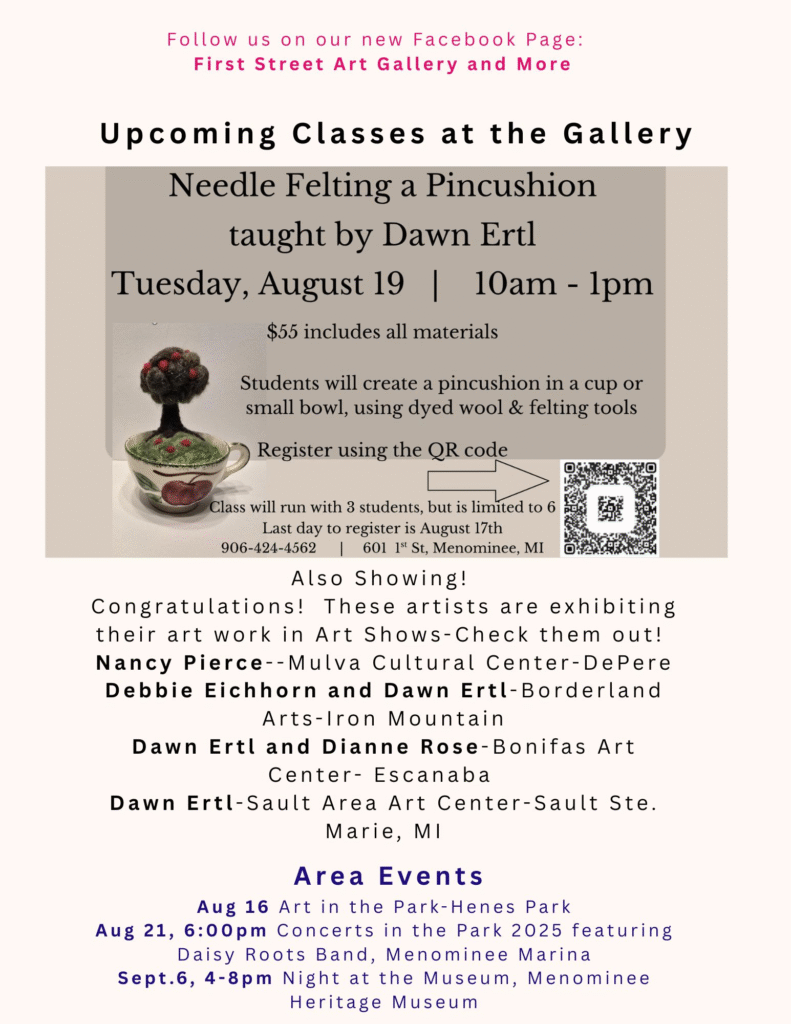 Needle Felting a Pincushion July 26, 2025 August 29, 20255:15 pm (1h) First Street Gallery | 601 1st Street, Menominee MI 49858 Register for Class Post navigation Basket Weaving – TestFELTING CHRISTMAS ORNAMENTS – Nov 14 Did you like this? Share it! 0 comments on “Needle Felting a Pincushion” Comments are closed.